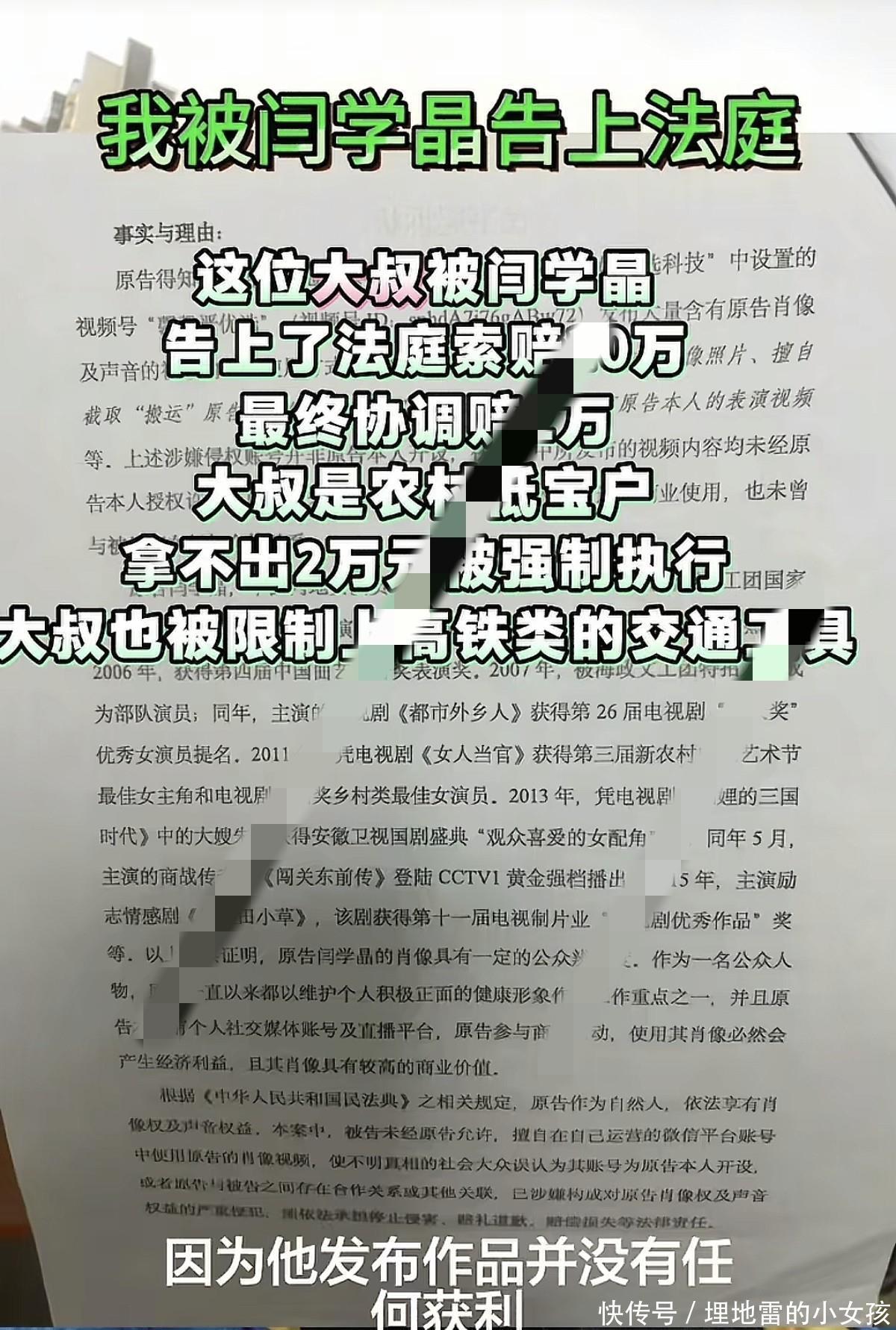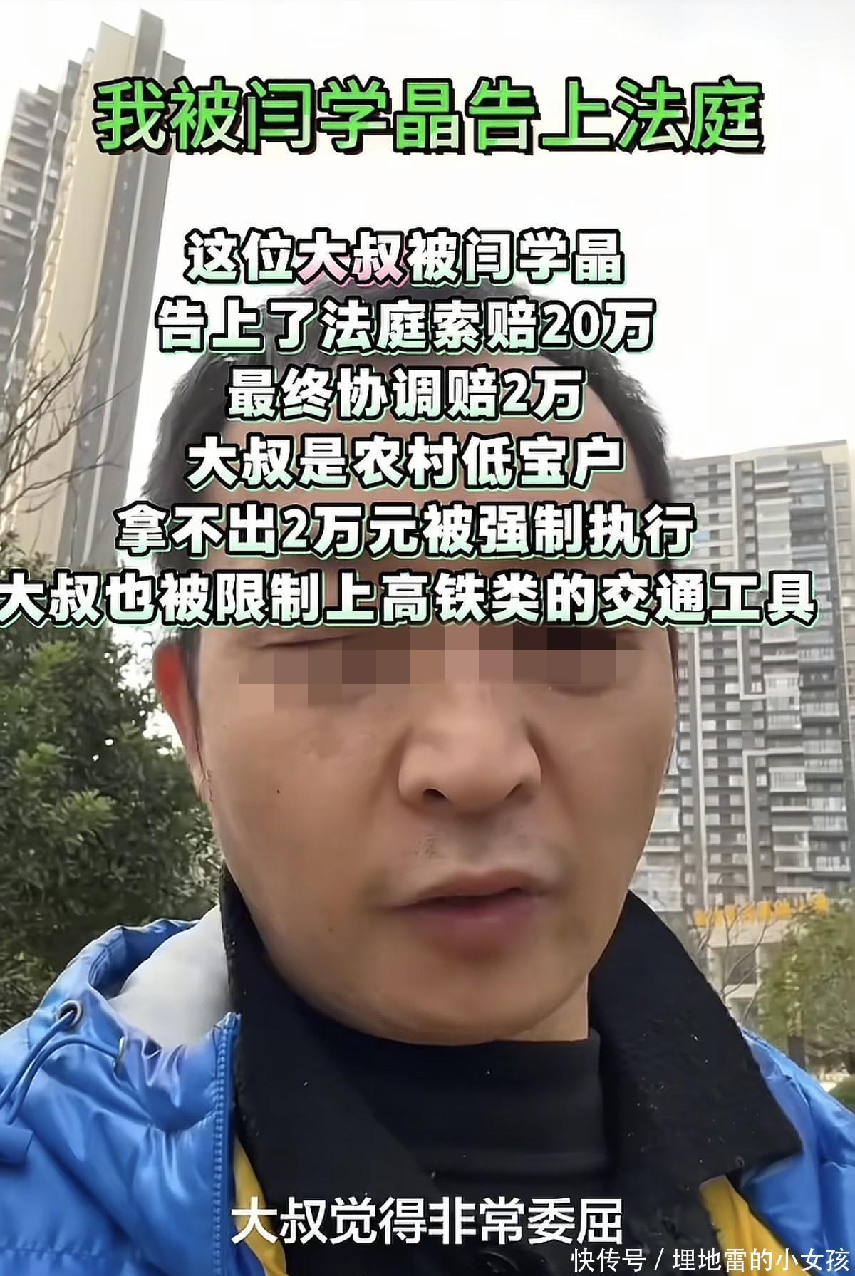 网上还有更劲爆的。12号,江西有个大叔发视频,手里拿着法院判决书,声泪俱下地说自己被闫学晶告了,要万。他说自己是低保户、单亲爸爸,连高铁都坐不了了。