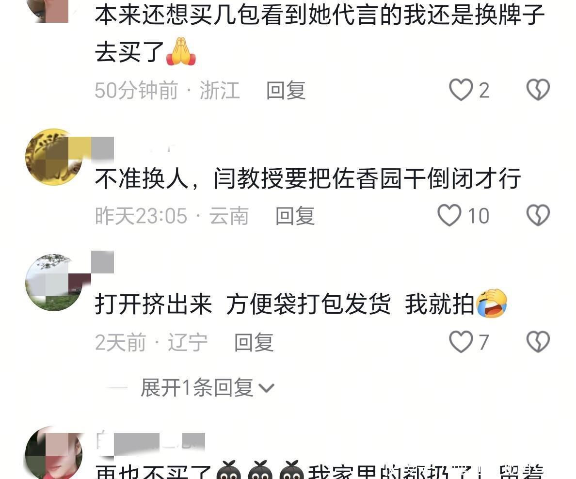 以前大伙冲着她的面子买,现在成了被抵制的对象。佐香园的官方账号底下全是骂声。“赶紧解约!”“不换代言人就不买了!”