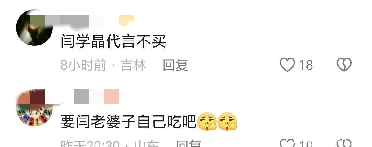 12万什么概念?相当于她儿子拍一部戏的片酬了。网友越扒越生气。佐香园这会儿躺枪了。这酱在东北挺有名,炒鸡蛋、蘸黄瓜、做炸酱面,家家都吃过。闫学晶给它代言好几年,包装上印着她那张大脸。